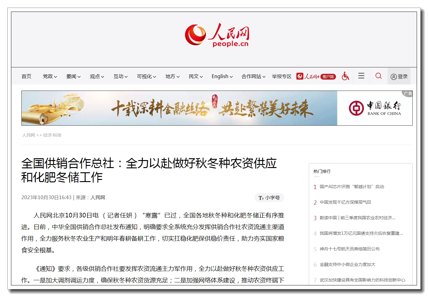 【人民網(wǎng)】全國(guó)供銷合作總社:全力以赴做好秋冬種農(nóng)資供應(yīng)和化肥冬儲(chǔ)工作